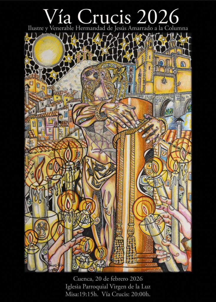 En primer plano podemos contemplar la imagen realista de Nuestro Padre Jesús Amarrado a la Columna, arropado a su izquierda por casas bajas, estrechas y reducidas, típicas del barrio del Perchel con las que puedes tocar los tejados. A la derecha de la talla «nuestra parroquia de la Virgen de la Luz, que se divisa al fondo con el puente de San Antón y su río Júcar». El momento temporal en el que se celebra el Vía Crucis, la noche del primer viernes de Cuaresma, «tiene su representación con un cielo negro, salpicado de estrellas, rompiéndose porque ya está flagelado».